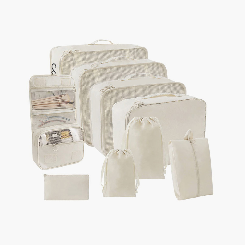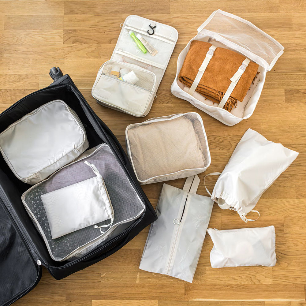 Komplet sæt med 4 packing cubes, 4 poser og 1 toilettaske