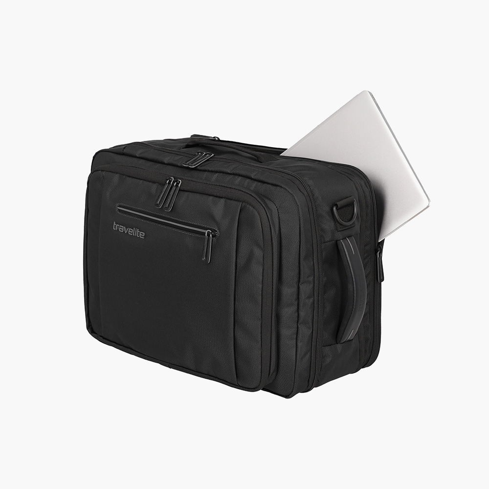 Tasken er udstyret med polstret ryg og behagelige skulderstropper, hvilket gør den nem at bære, selv når den er fyldt. Skifter du til taske-funktionen, giver de bløde håndtag i toppen og siden en praktisk og professionel fremtoning.